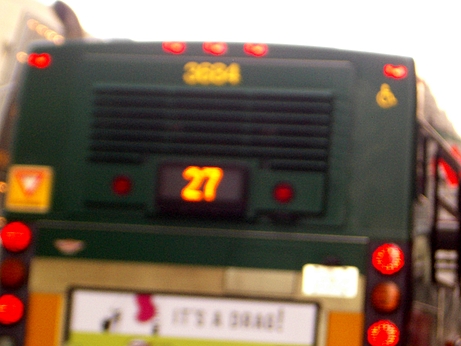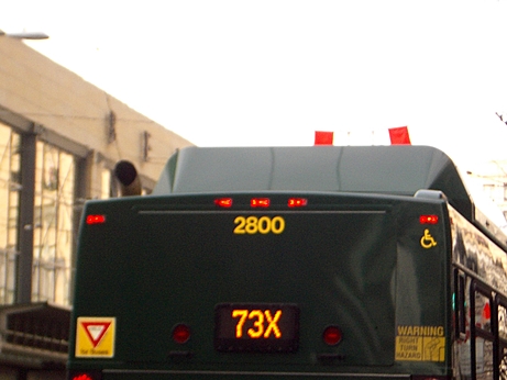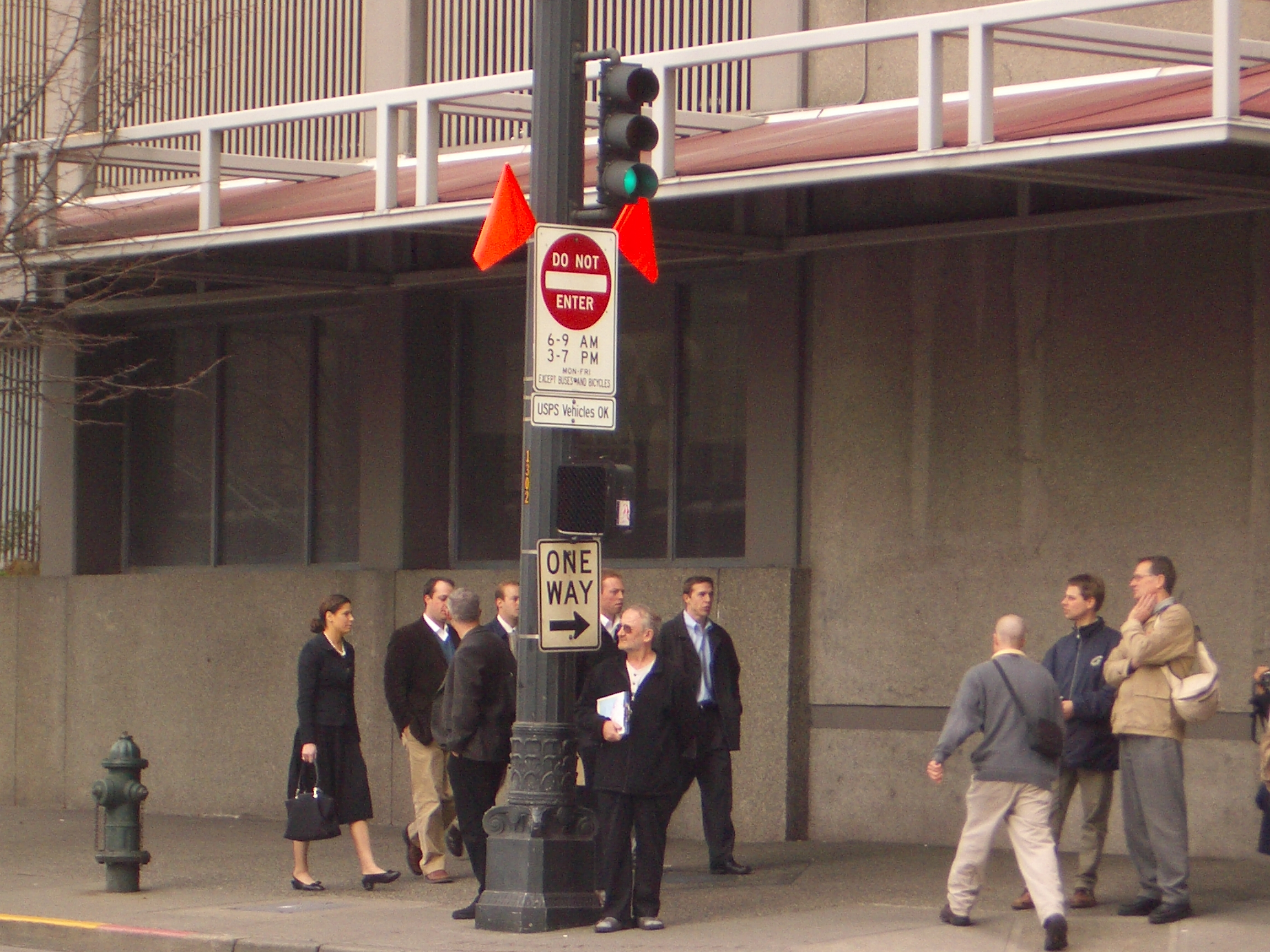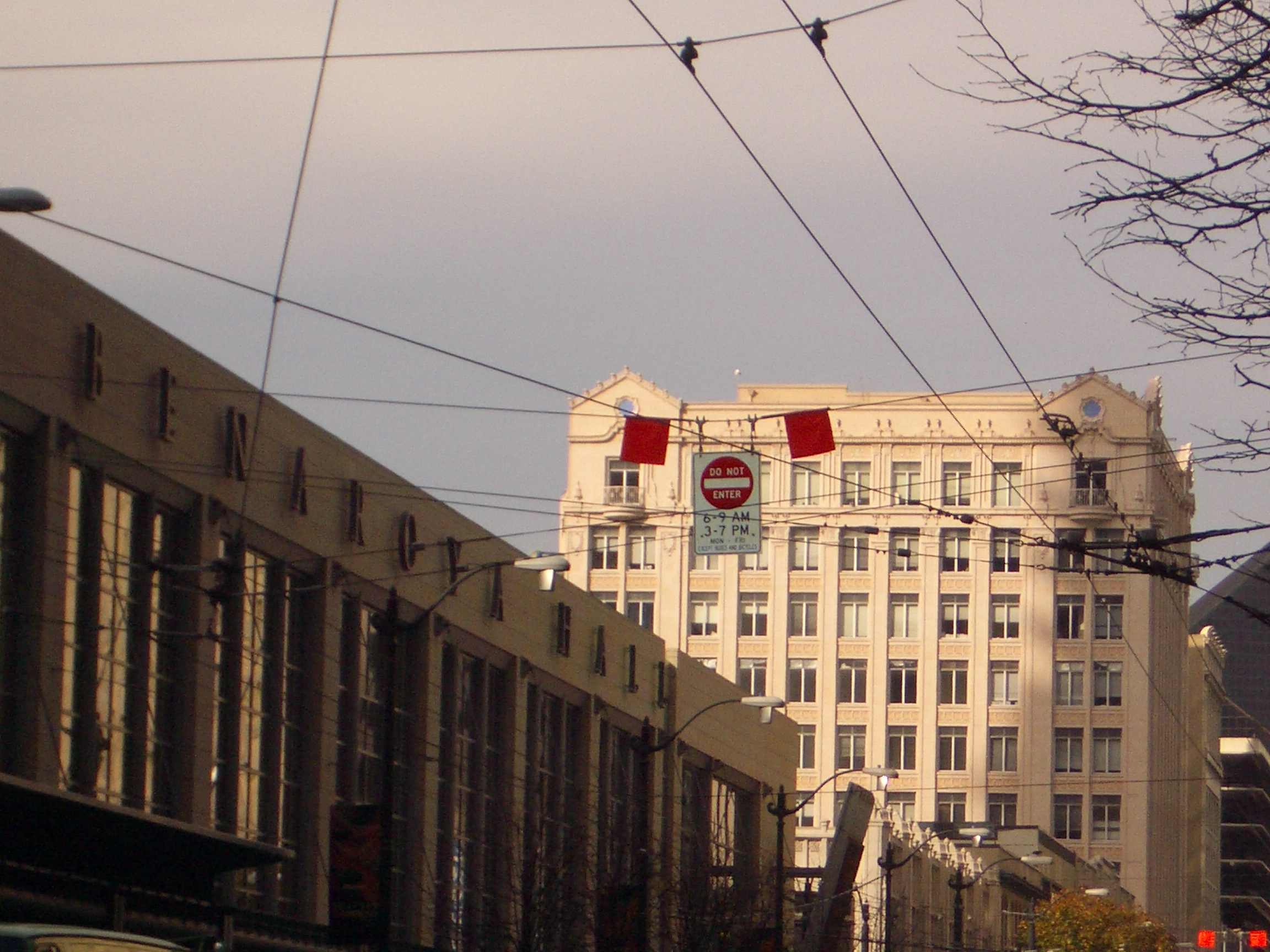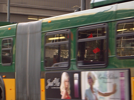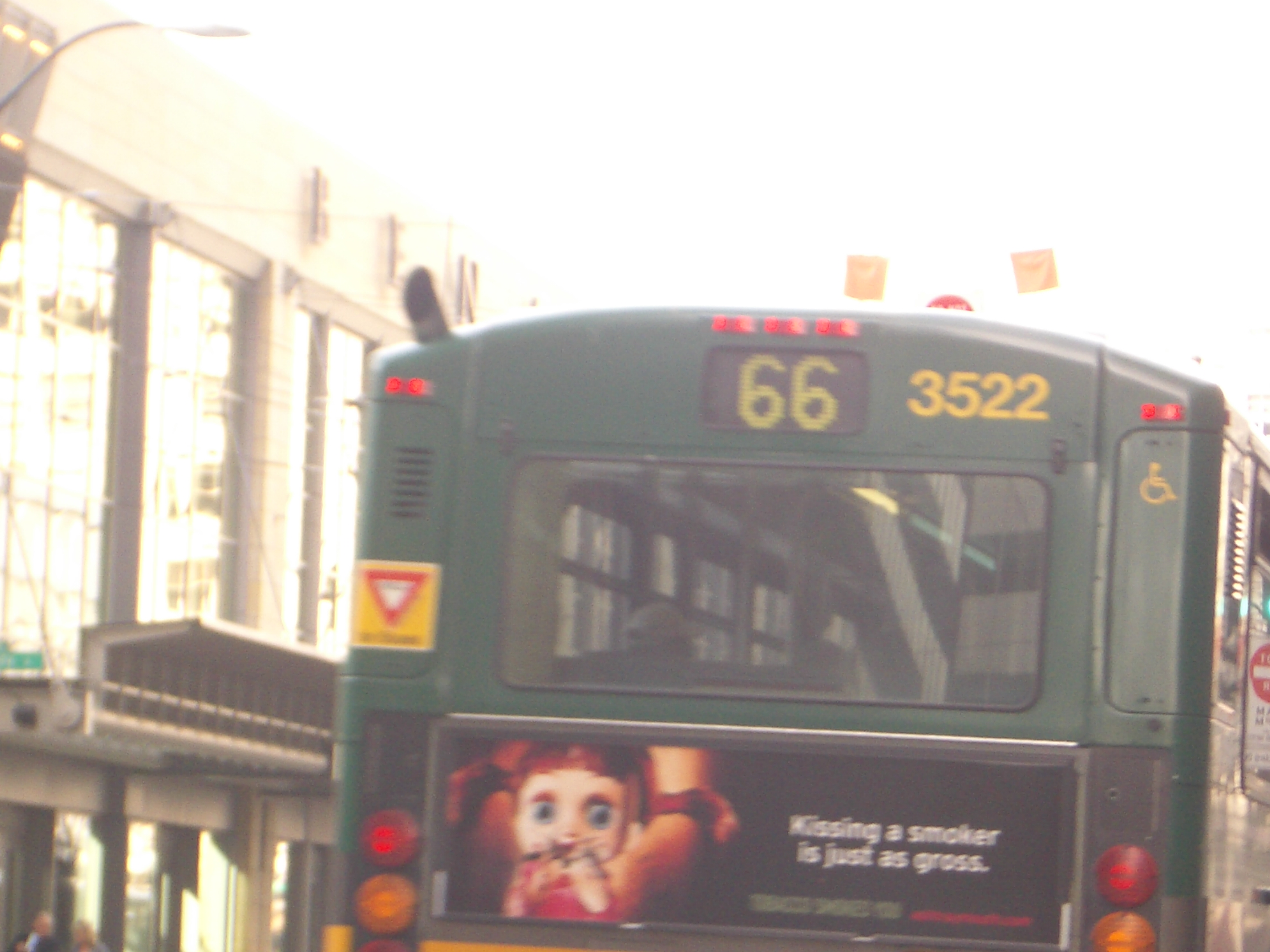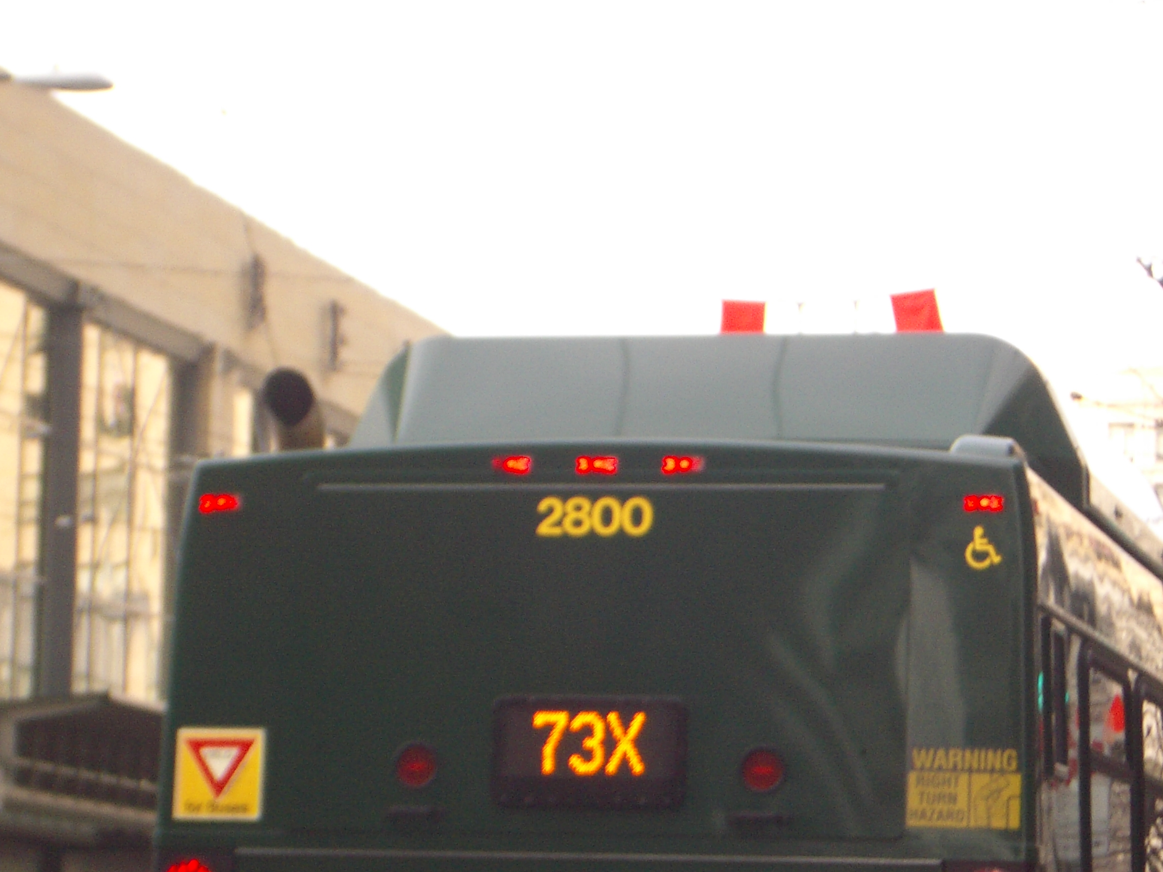 These pictures illustrate the corner "no entry" sign blocked by a bus on the right. Note that the reflection of the sign you see on the bus is actually from the other side of the street. Look at the building details and make sure everything lines up (see also picture below for reference). Also note the amount of blockage above and beyond the sign and up through the light.